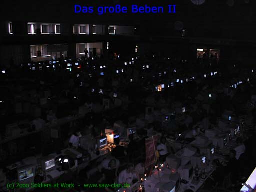 Am Samstag-Morgen brachen wir nach einem ausgedehntem Frühstück um etwa 10:00 wieder zum Beben auf. Unsere Rechner standen alle noch, und [S@W]Godspeed hatte die ganze Nacht an irgendwelchen dubiosen Turnieren teilgenommen und starrte dementsprechend fit aus der Wäsche! =:)