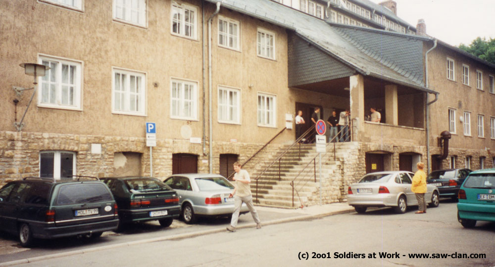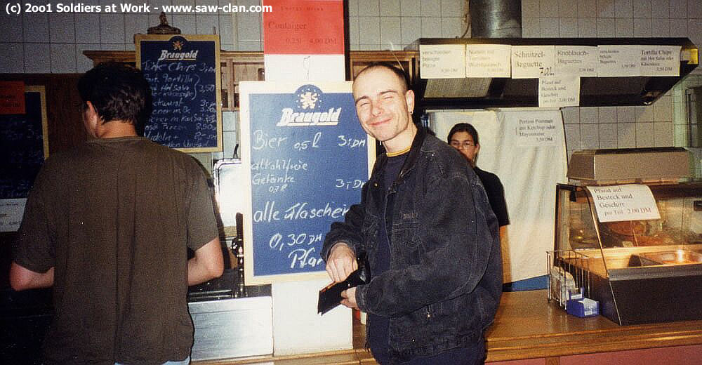Für das leibliche Wohl sorgte neben einem Catering Service auch eine kleine Kantine. Hier gab es eine (allerdings viel zu kleine) Pizza und einen ordentlich scharfen (und ebenfalls knapp bemessenen) Wurstgoulasch. Auf dem Bild sieht man [GoE]Wiggi, als noch, strahlend wie ein Honigkuchenpferd, in seiner Brieftasche wühlte - bevor er nach dem Verzehr einer Pizza abwaschen musste! =:)