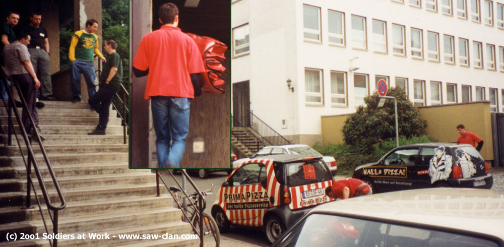 Gegen Nachmittag häuften sich die Lieferwagen vor der Tür, teilweise im Akkord schleppten die armen Pizzajungen riesige Stapel Pizza in die Halle.
