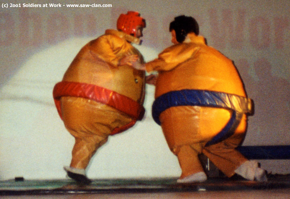Während die Turniere vor sich hinliefen, wurde auf der Bühne vorne Abwechslung geboten. Diverse Vergnüglichkeiten wie Sumo waren auf einer LAN einfach mal etwas anderes. Hier kämpfen gerade [S@W]Preacher und [S@W]X-Fire gegeneinander.