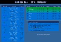 Breits am Freitag Abend starteten die Turniere. Am aufwändigsten war natürlich das TFC Turnier zu organisieren, weil hier immerhin Teams von 8 Mann "zu verwalten" waren. Schnell zeigte sich, daß das vorhandene Turnierscript für diesen Wettbewerb ungeeignet war, da sie lediglich ein KO-System unterstützten. Für einige der 7 angetretenen TFC Teams wäre das Turnier also nach dem ersten Match gelaufen gewesen.