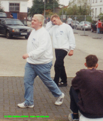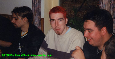 CD-Kaserne Von Links nach Rechts: [S@W]Beaker, [AEG]Heinz und [AEG]Brain beim Verzehr der Schnitzel in Schuhgröße 42. Heinz versucht hier offensichtlich das Teil im Stück zu verschlucken.