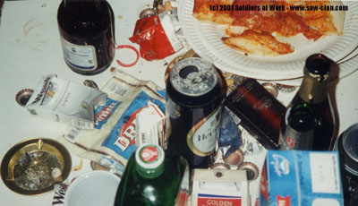 Der Rest des Abends verging...nunja...im Alkohol. Ich glaub irgendwie war unser ganzer Clan ziemlich breit. Das war insofern etwas dumm, eildiweil die Turniere noch am selben Abend begannen. Wir hatten wohl auch ein Match, aber großes Sorry, ich weiß leider nicht mehr gegen wen, noch was für Maps gespielt wurden. Leider konnte sich auch kein anderer mehr dran erinnern, nur daß wir wohl irgendwie gewonnen haben, und Lehmi in der letzten Minute des Matches mit dem Kopf auf seine Tastatur gefallen ist! =:)